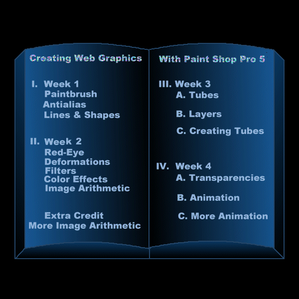 Week 1 Assignments - Paintbrush, Antialias, Lines & ShapesWeek 2 Assignments - Red-Eye, Deformations, Filters, Color Effects, Image ArithmeticWeek 3 Assignments - Tubes, Layers, Creating TubesWeek 4 Assignments - Tranparencies, Animation, More Animation